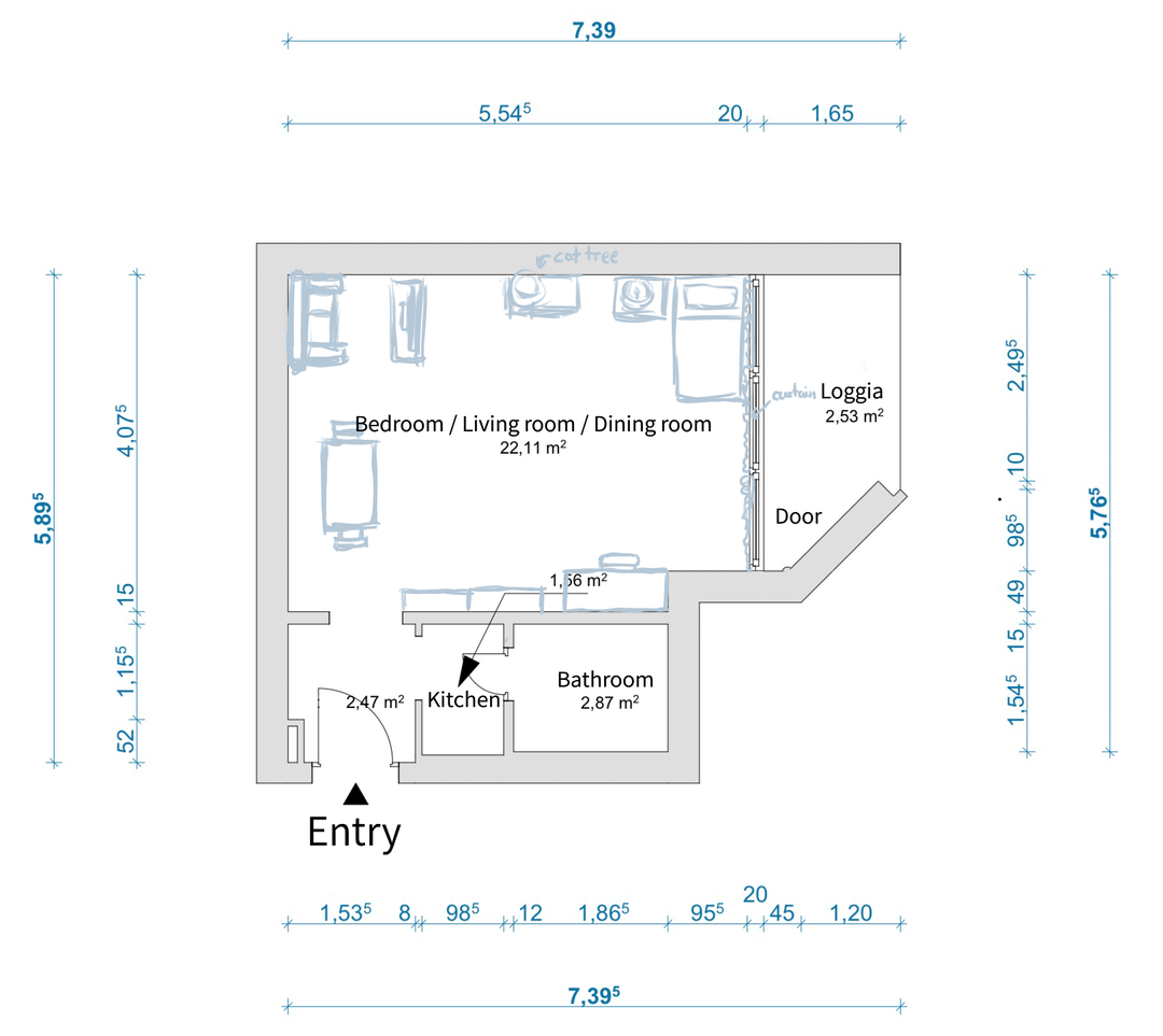 そこに含めたい主なものは次のとおりです。 – ベッド+小さなナイトスタンド – 机 – ダイニングテーブル – 本棚 + クローゼット – 猫の家具 – (オプション) ソファ + テレビ 下書きは作成したのですが、なんだかしっくりこないんです。真ん中のスペースを有効活用する方法はないでしょうか?助けていただければ幸いです。