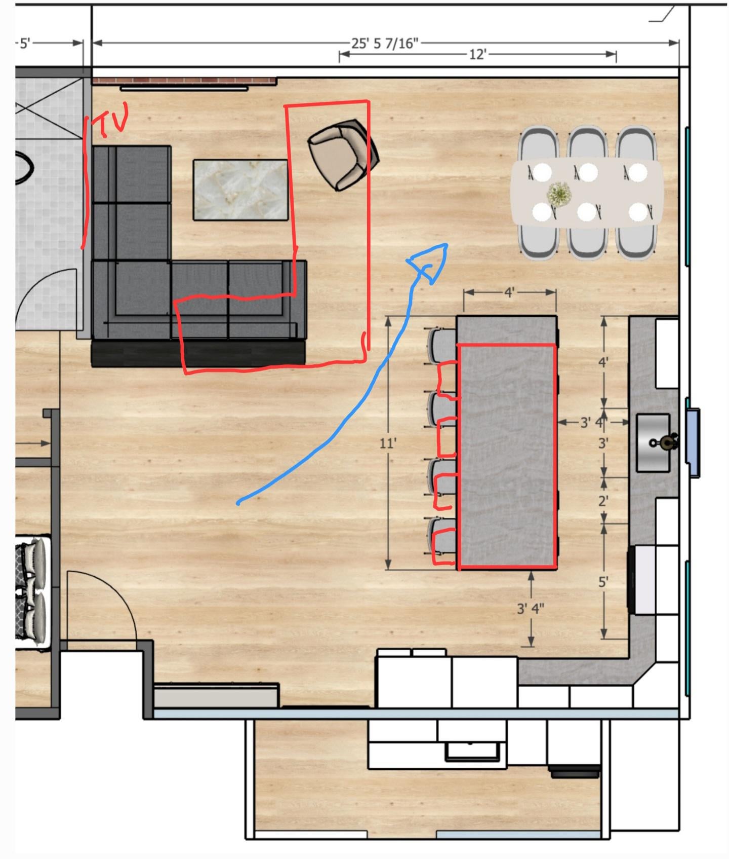 レンダリングの苦労 – テレビを暖炉の上に取り付けたくないので、反対側の壁に移動しています (アイランドキッチンも 11 フィートから 9 フィートに小さくしています)。つまり、ソファはテレビの方向を向くことになります。ウエストエルムリロイ108を購入予定です" リクライニングソファ。 青い矢印は散策路ですが…人が快適に歩けるスペースはあるでしょうか? 何か提案はありますか? ありがとう!!!