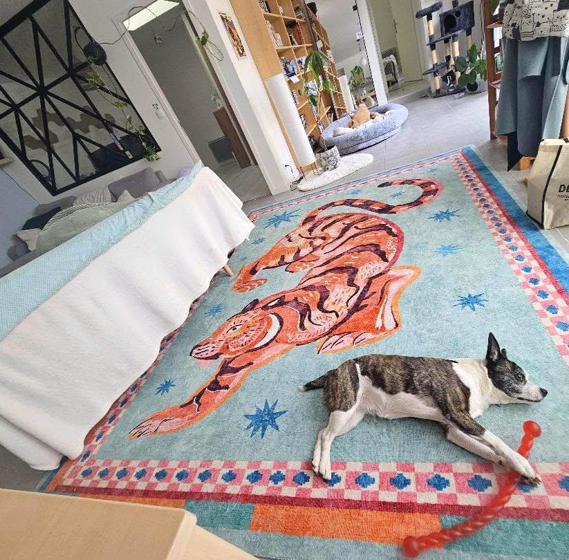 醜い灰色のタイルを隠すために新しい敷物を敷きました 🐅